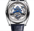 The triangular bridge, polished metal frame, and deep-blue components create a unique futuristic look inspired by high-end Swiss horology.