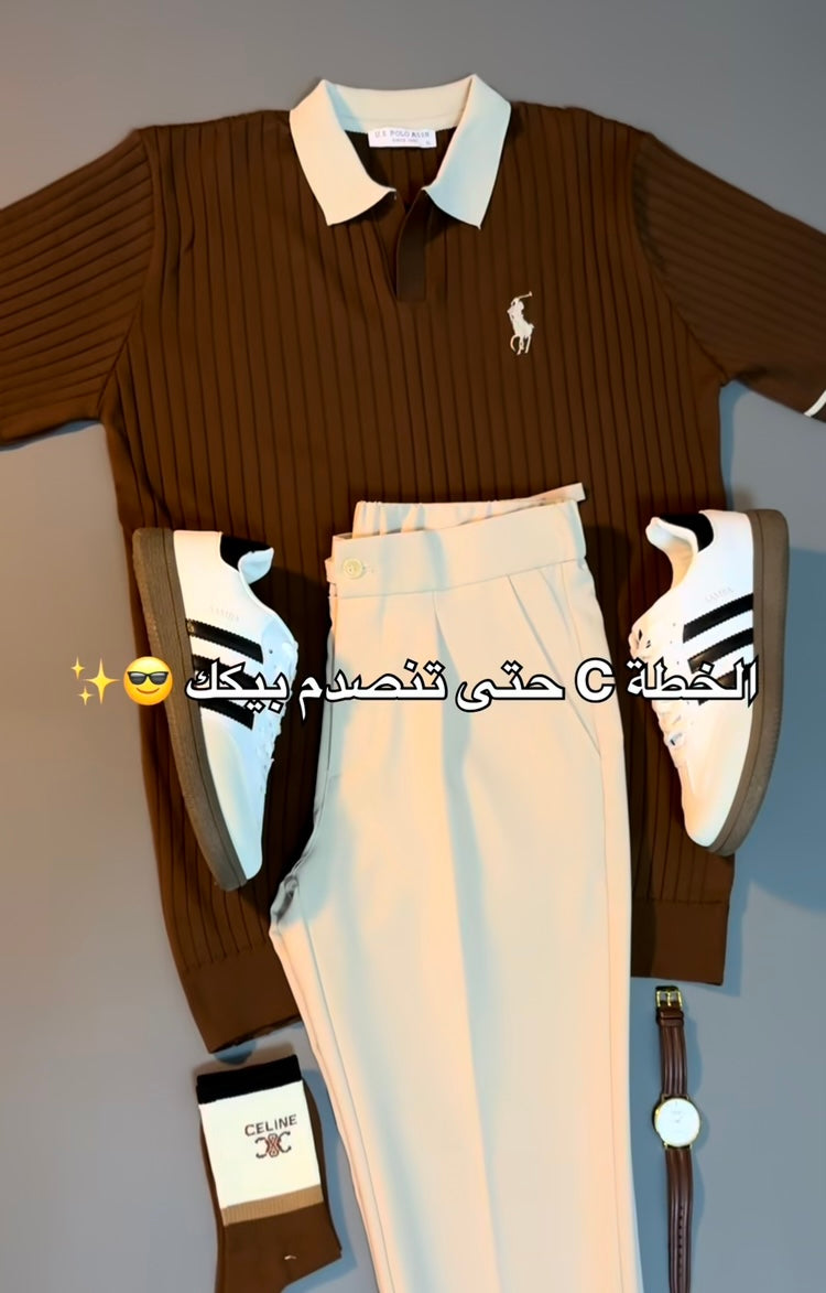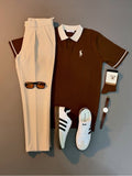 Perfect Combo: T Shirt, Pants & Sneakers& Watch "التركيبة المثالية: قميص، بنطال وأحذية رياضية!" – White & Brown Combo